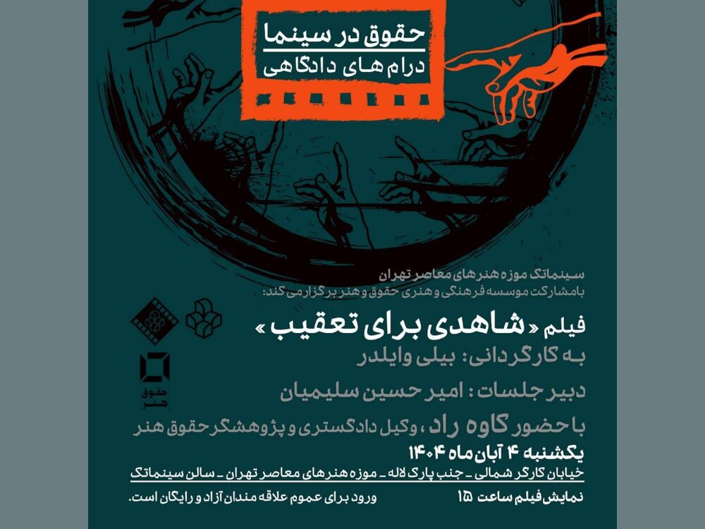 سینماتک موزه هنرهای معاصر تهران در ادامه برنامه‌های «حقوق در سینما» با محوریت درام‌های دادگاهی، فیلم «شاهدی برای تعقیب» به کارگردانی بیلی وایلدر را به نمایش می گذارد.