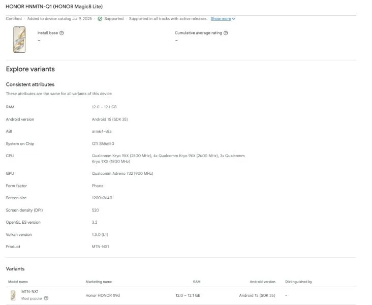 بهطور همزمان، گوشی Magic 8 Lite در فهرست Google Play Console نیز رؤیت شده که تراشه بهکاررفته در آن را تأیید میکند. طبق اطلاعات منتشرشده، این مدل از تراشه Snapdragon SM6650 یا همان Snapdragon 6 Gen 4 قدرت میگیرد.