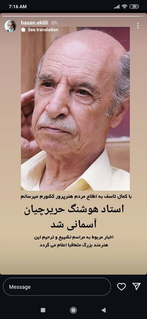 حسن اکلیلی (بازیگر اصفهانی) در ساعات اولیه بامداد ۳۰ مرداد در صفحه شخصی‌اش در فضای مجازی خبر درگذشت هوشنگ حریرچیان (بازیگر قدیمی) را منتشر کرده است.