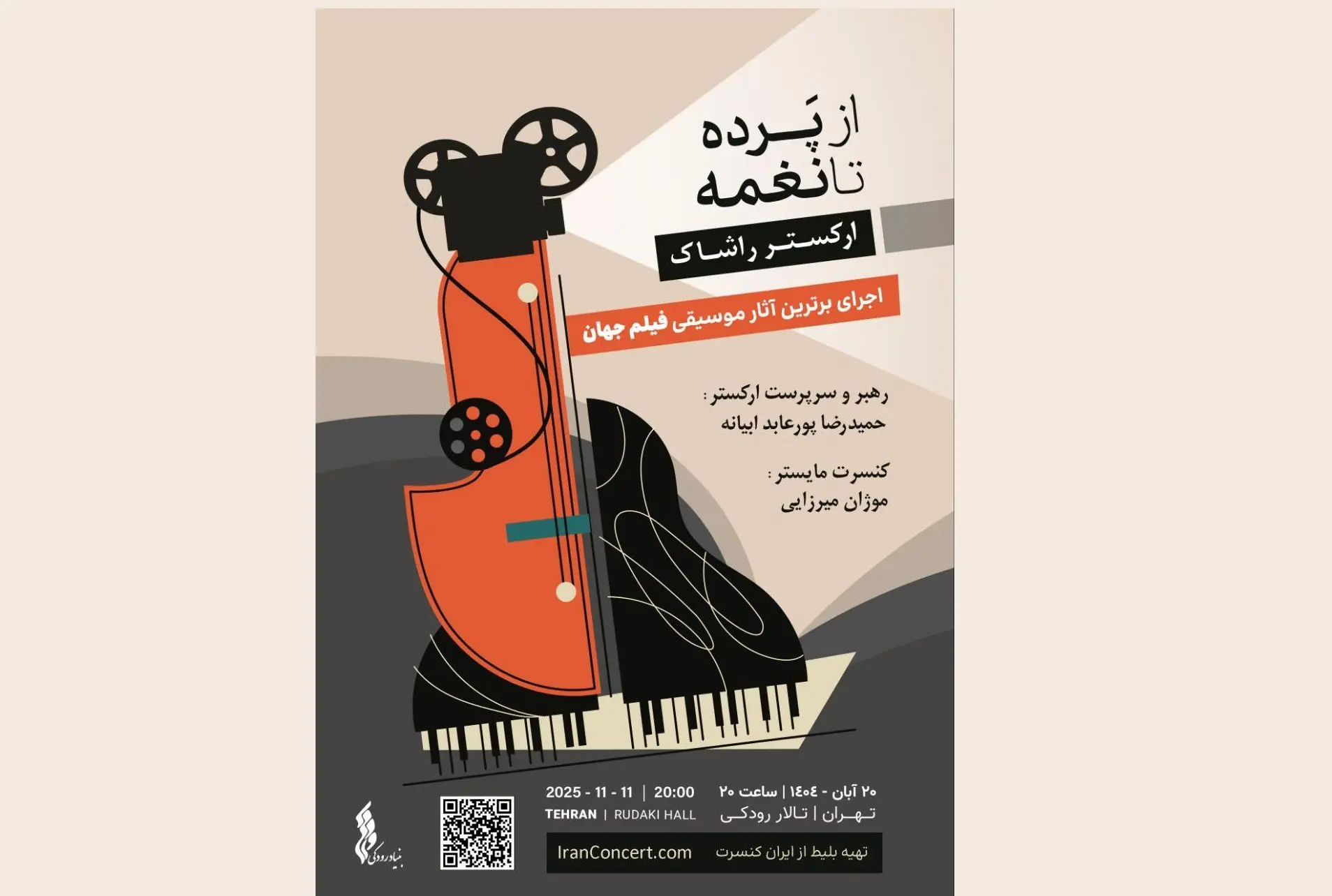 به گزارش ایلنا، ارکستر موسیقی فیلم راشاک به رهبری حمیدرضا پورعابد ابیانه با اجرای آثاری از برترین آهنگسازان موسیقی فیلم جهان، در شامگاه ۲۰ آبانماه در تالار رودکی به روی صحنه میرود.